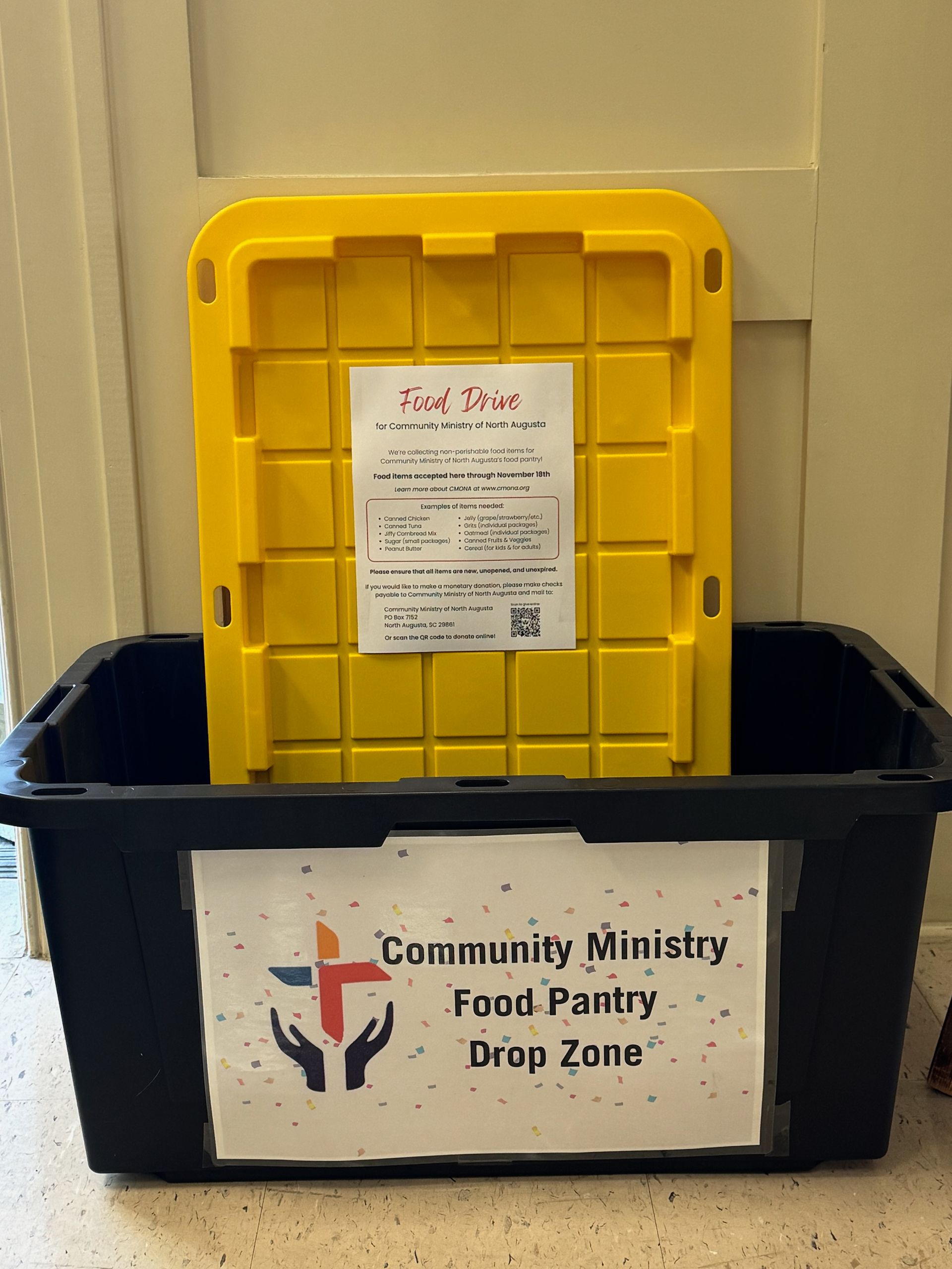 In the Asbury Building Lobby and across from the Wesley Center elevator, there are now Community Ministry Food Pantry Drop Zones. If you would like to donate to Community Ministry's Food Pantry, but are unable to do so during their open hours, we have several Community Ministry volunteers who are happy to regularly monitor these drop zones and make delivers on your behalf!