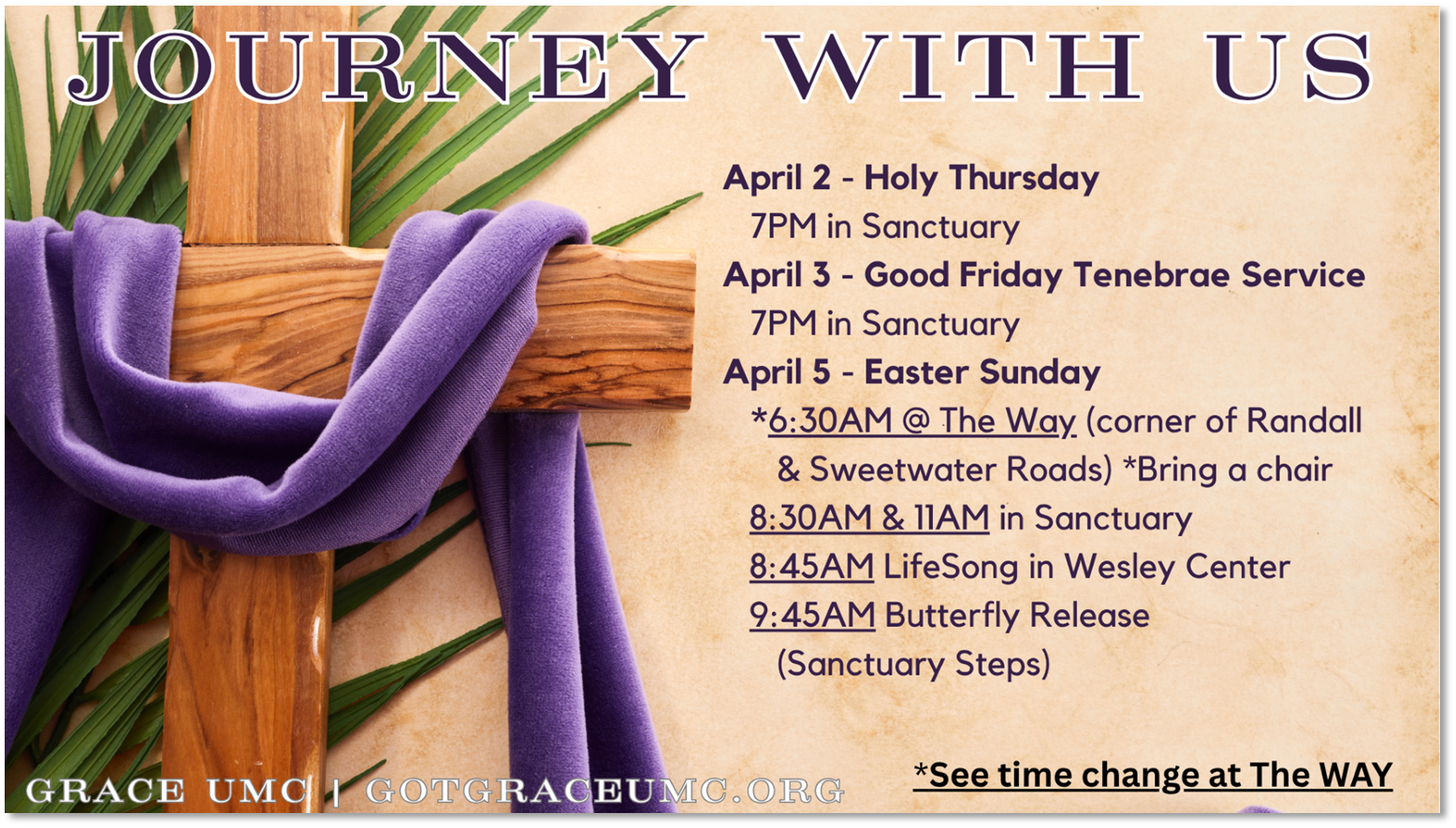 Special Event: Procession of the white paraments and brass and Bible at 11:00am only (NO COMMUNION at 8:30 and 11:00; communion at Sunrise and LifeSong); Butterfly release after LifeSong